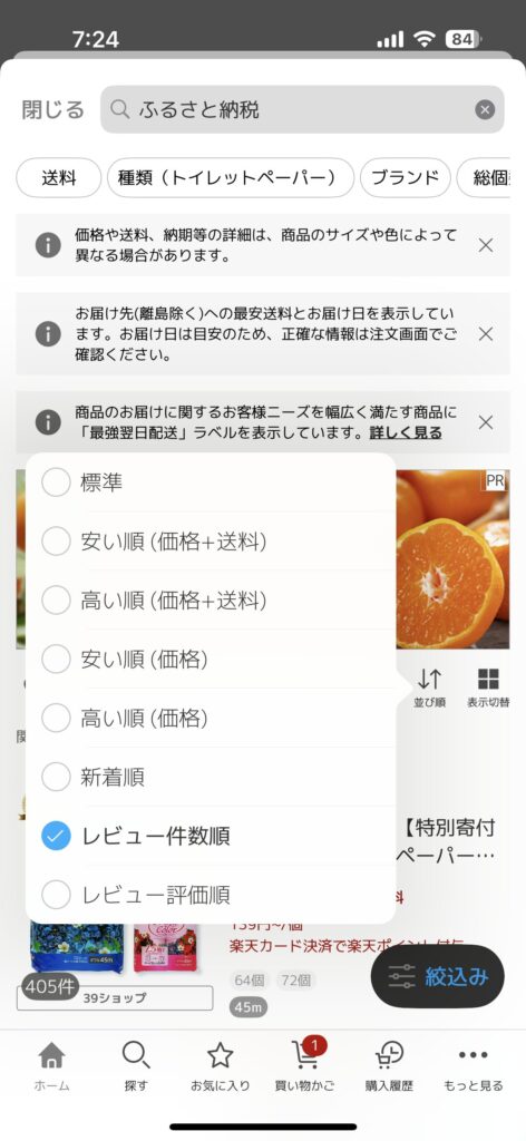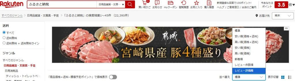 なので私が楽天市場でふるさと納税の返礼品を検索するときは、レビュー件数の多い順に並べることをよくやっていて、そのうえでレビュー評価が良いものをピックアップしています。