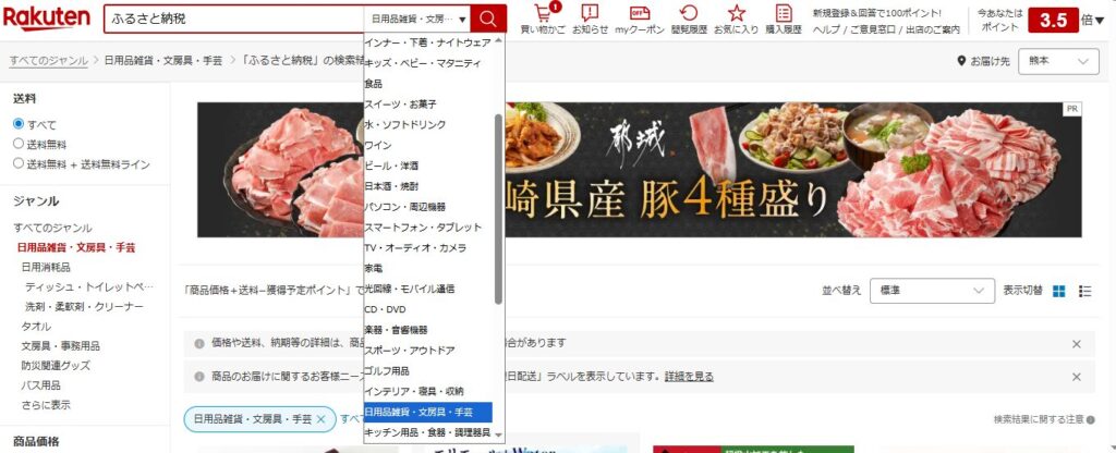 標準では「すべてのジャンル」になっていますが、今回はトイレットペーパーを探しているので「日用雑貨・文房具・手芸」を選択します。